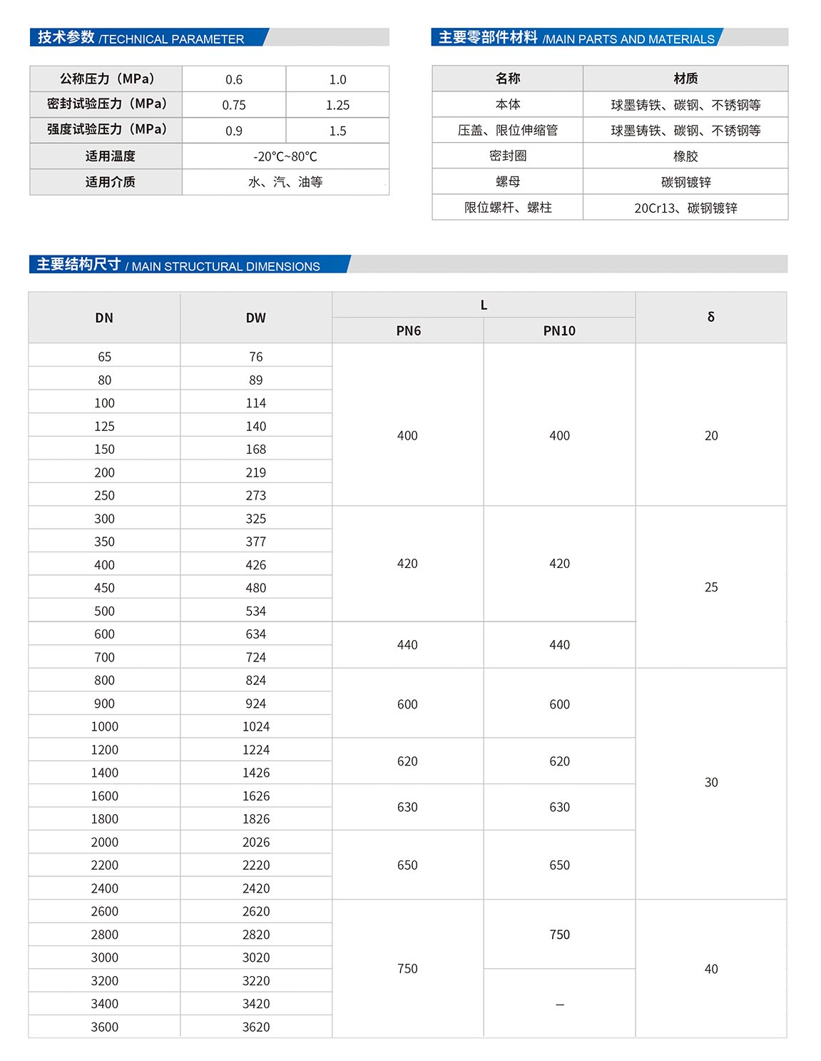 雙法蘭傳力接頭:由本體,密封圈,壓蓋,伸縮短管等主要部件組成。該產(chǎn)品適用于兩邊均為法蘭連接的管道中,安裝時調(diào)節(jié)產(chǎn)品兩端的法蘭的安裝長度,對角均勻擰緊壓蓋螺栓,使其成為一個整體,并有一定的調(diào)節(jié)量,方便安裝維修時,根據(jù)現(xiàn)場尺寸進行調(diào)整。在工作時可以反軸向推力傳遞至整個管道。雙法蘭傳力接頭是由法蘭松套伸縮接頭和短管法蘭,傳力螺桿等構(gòu)件組成,能降低被連接件的壓力推力(盲板力)和補償管路安裝誤差。雙法蘭傳力接主要用于泵、閥門等附件的松套連接。