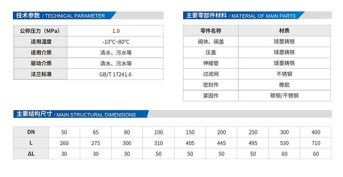伸縮過濾器是過濾器和伸縮接頭的組合,它也是輸送介質(zhì)管道上不可缺少的一種裝置,通常安裝在減壓閥、泄壓閥、定水位閥或其它設(shè)備的進口端。當管道中的介質(zhì)進入過濾器時,介質(zhì)通過濾網(wǎng)進入被連接的閥門中,而雜質(zhì)則留于過濾桶內(nèi),使各類閥門不會由于機械雜物卡入密封圈而失靈。另加不銹鋼伸縮拉桿,補償管道尺寸,安裝靈活。